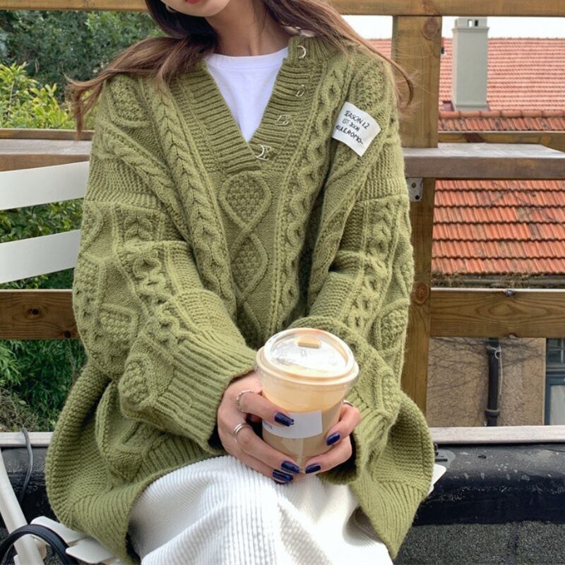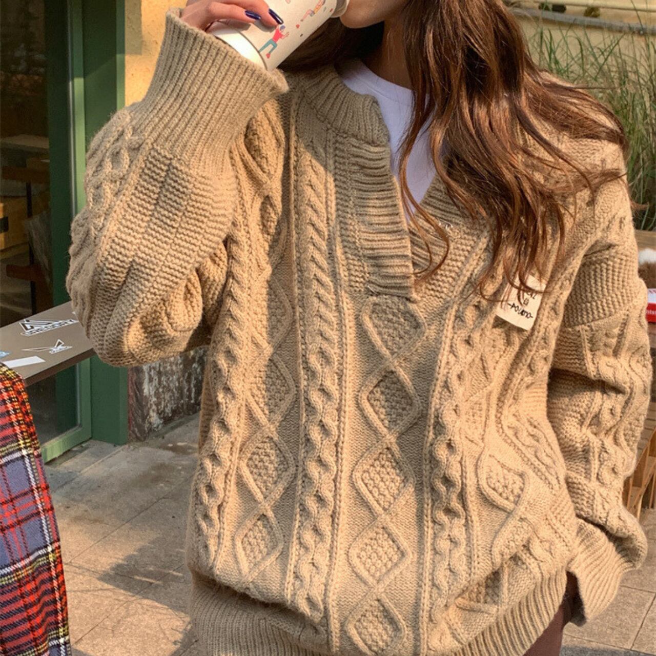 着用するだけで上品で大人可愛い雰囲気が漂うVネックエレガントツイストブレイディドニット。