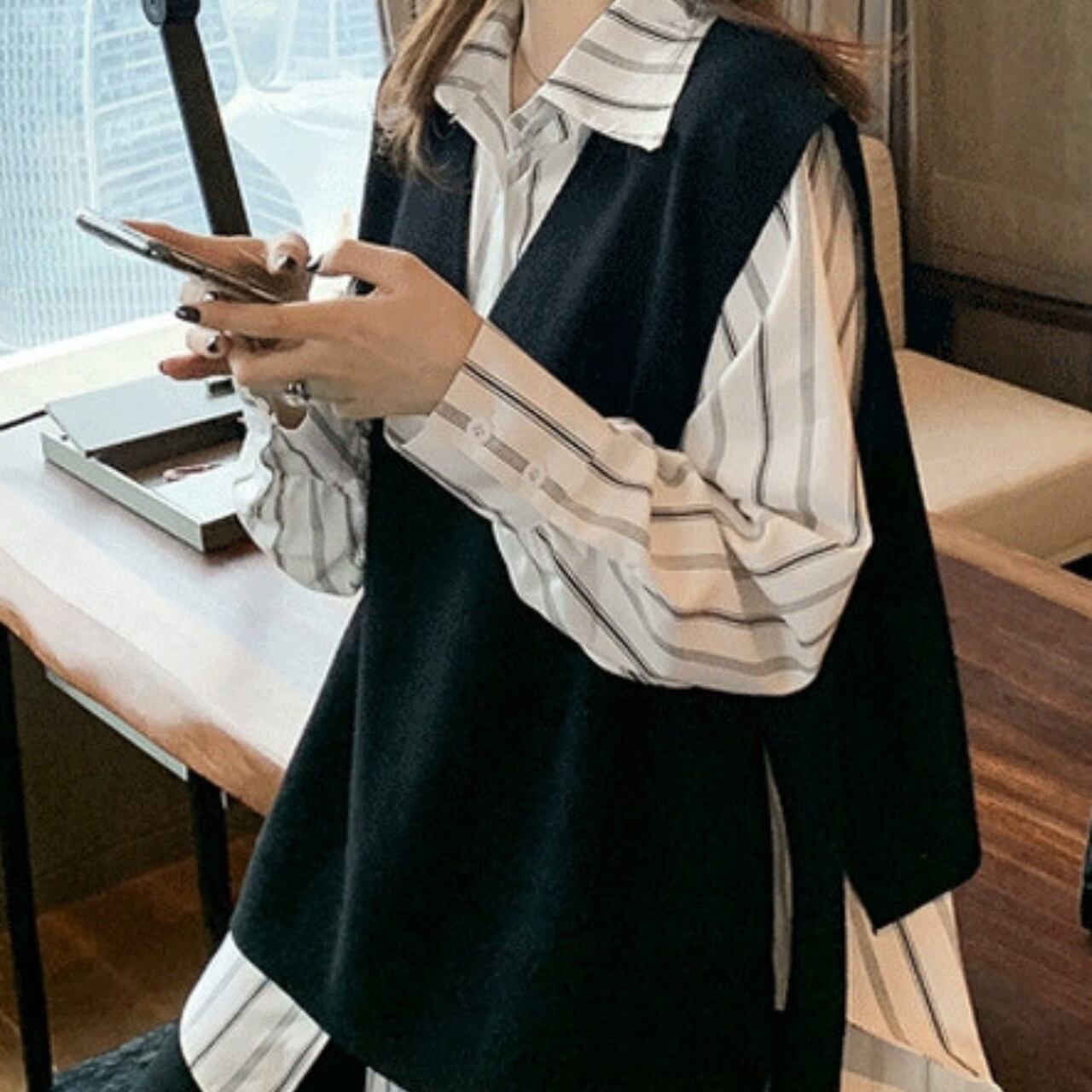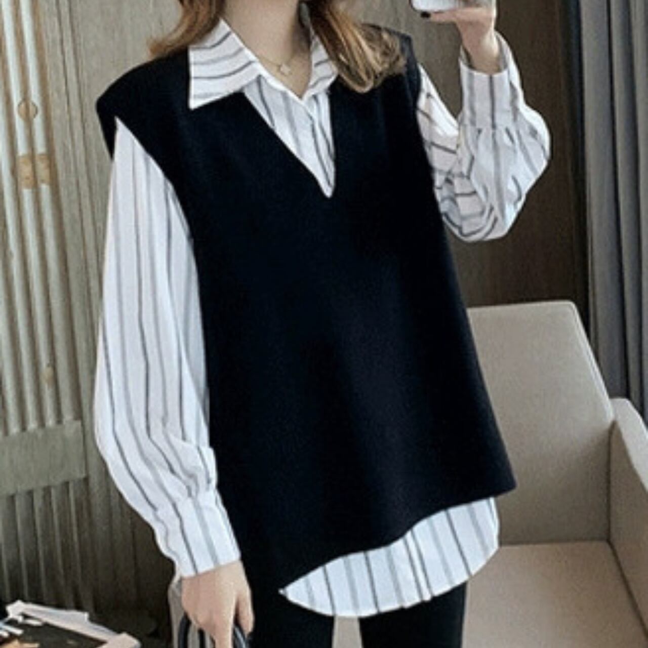 着用するだけで上品で大人可愛い雰囲気が漂うツーピースエレガントベスト&ストライプシャツ。