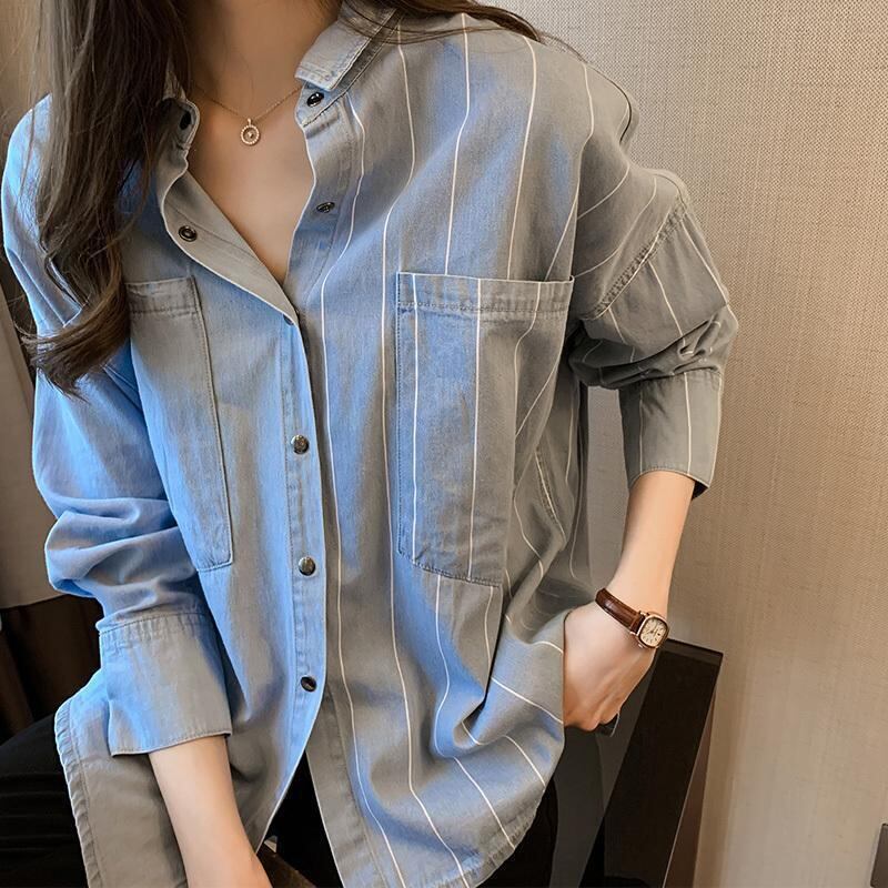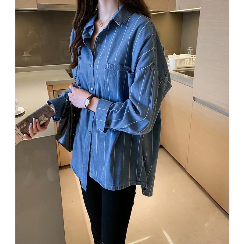 Striped asymmetric elegant denim shirt (2color)