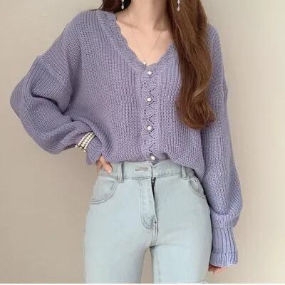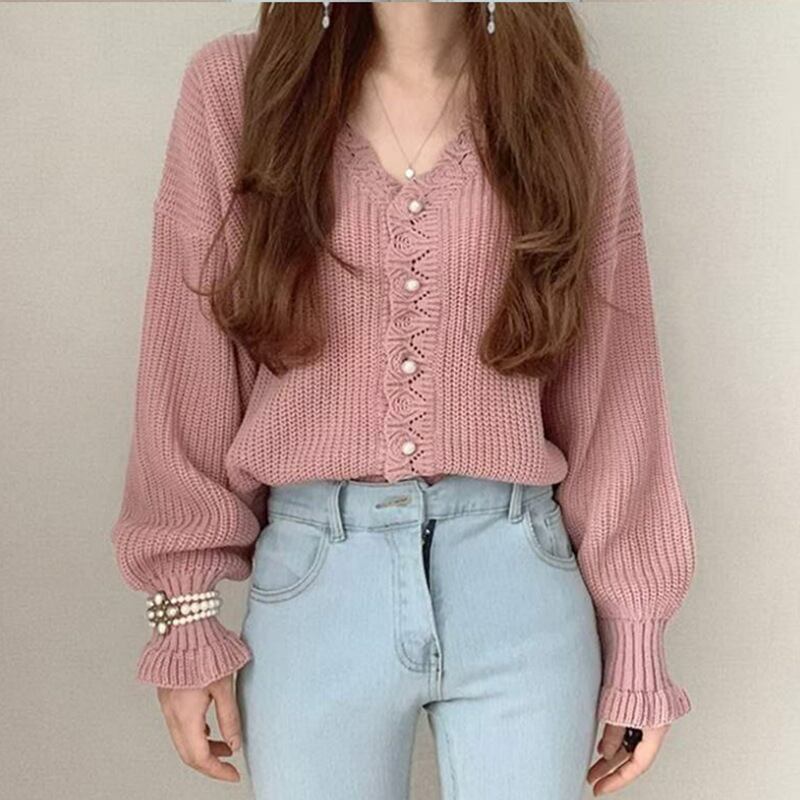 V-neck elegant puff sleeve cardigan knit