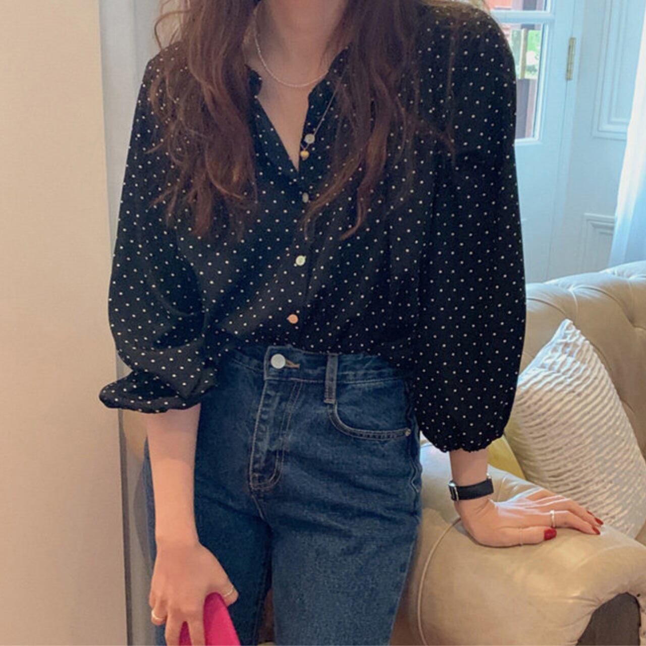 着用するだけで大人可愛い雰囲気が漂うドットパターンエレガントシフォンシャツ。
