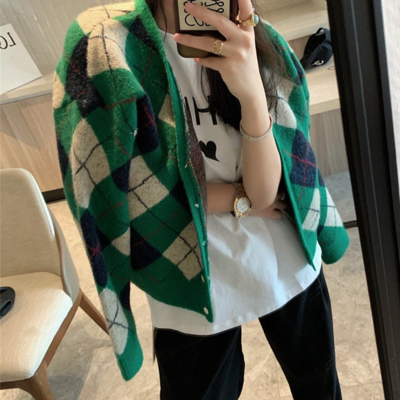 着用するだけで大人可愛い雰囲気が漂うVネックエレガントレトロダイヤモンドパターンカーディガン。