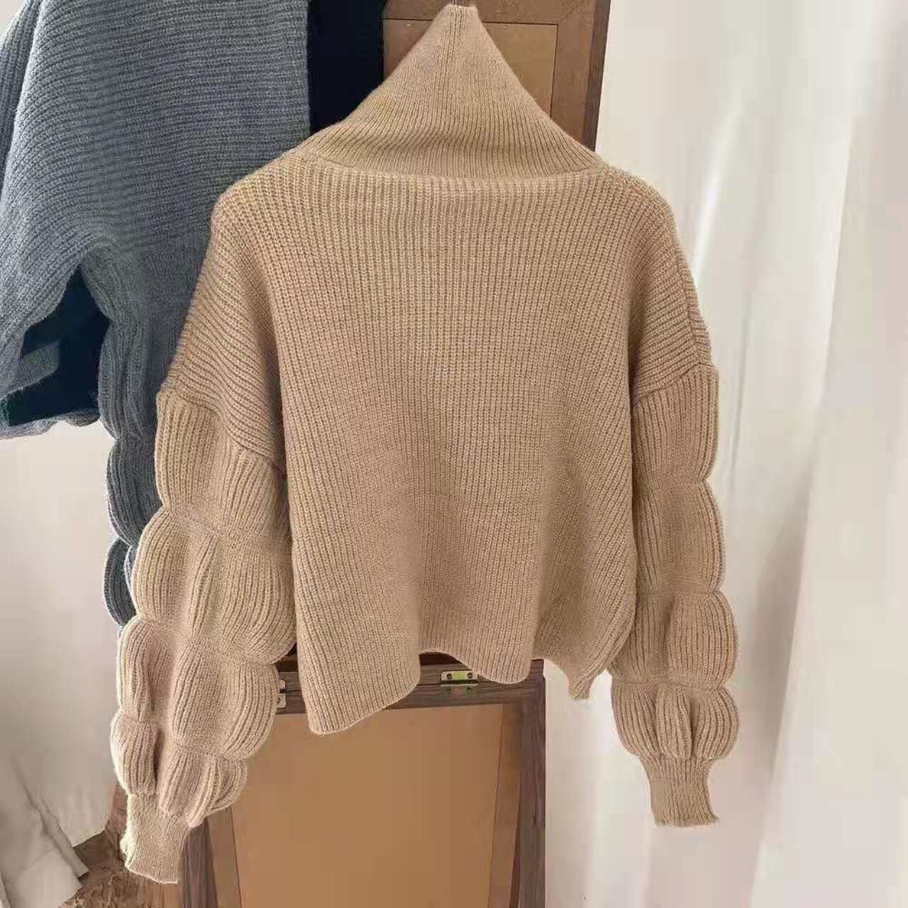 着用するだけで大人可愛い雰囲気が漂うハイネックエレガントランタンスリーブショートニット。