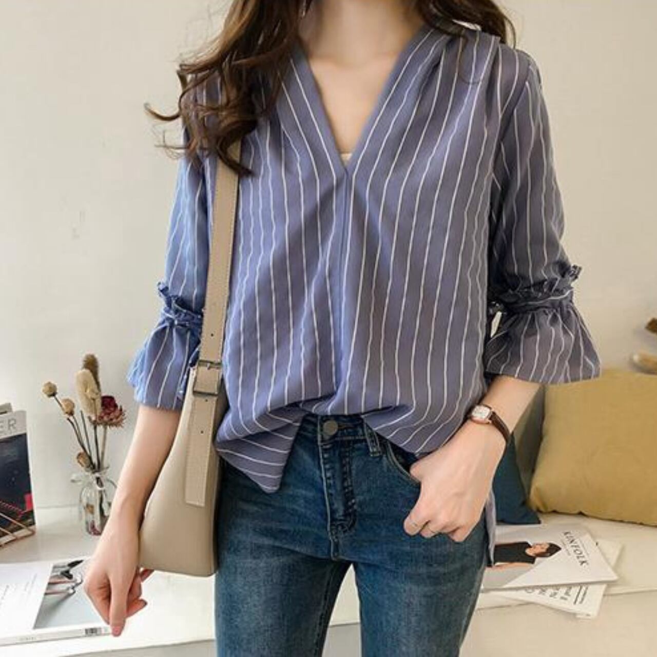 着用するだけで大人可愛い雰囲気が漂うフリルスリーブエレガントVネックシャツ。
