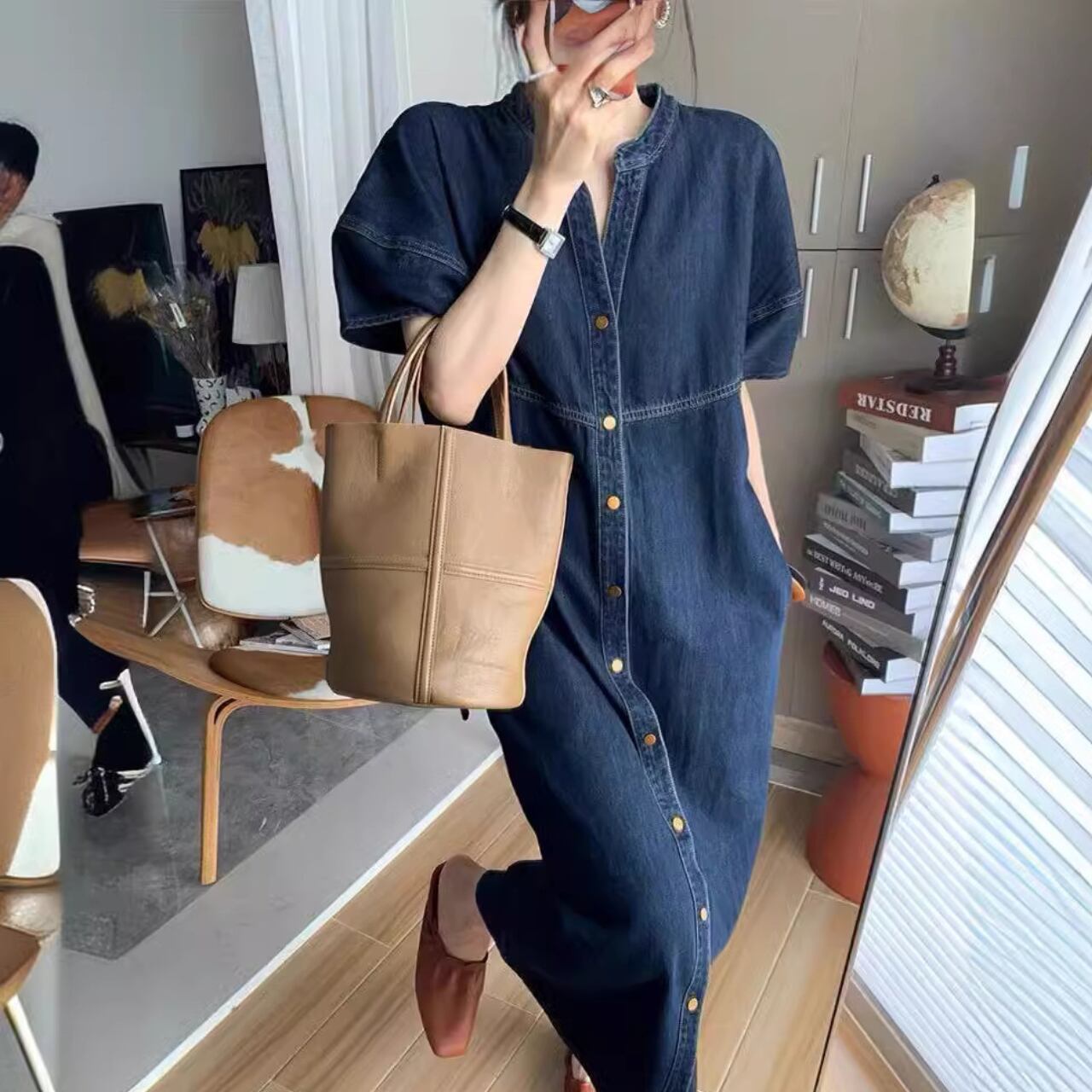 着用するだけで大人可愛い雰囲気が漂うフレンチレトロエレガントミッドレングデニムドレス。